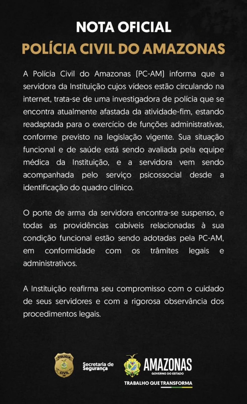 Diante do acontecimento, a Polícia Civil do Amazonas (PC-AM) divulgou uma nota de esclarecimento. A PC-AM disse que a mulher em questão é uma investigadora e que se encontra afastada das funções.